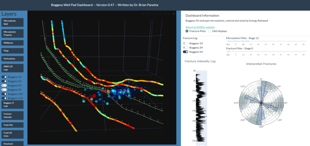 Below are a few of my latest 3D Visualization projects that you can explore. The Boggess project is a dashboard of 6 horizontal Marcellus wells from West Virginia. The Illinois project is a from a carbon sequestration project with two vertical wells, a CO2 well and a monitoring well. The microseismic data tracks the plume movement over a period of six years.